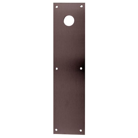 3" x 12" oil rubbed bronze push plate. Beveled edges, adhesive mounting, rounded corners, cylinder cut-outs are available.