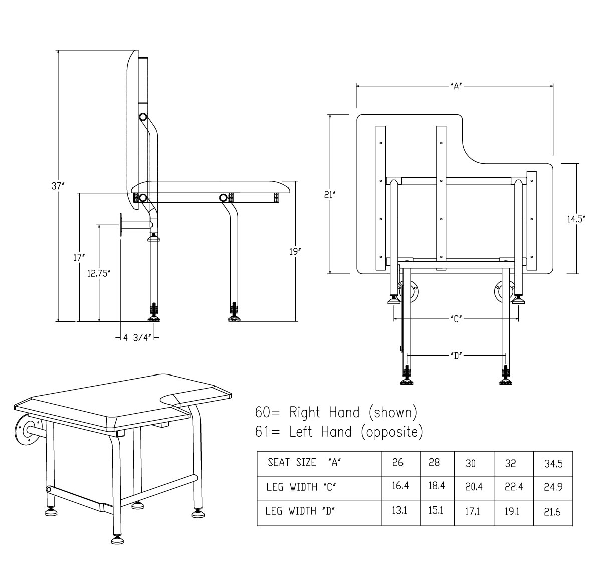 Elcoma 60-PA2802WLEG-01 28" x 21" Elite Series Adult Fold Down L-Shaped Shower Seat with Legs - Right Handed - Almond Padded Seat with Powder Coated White Legs