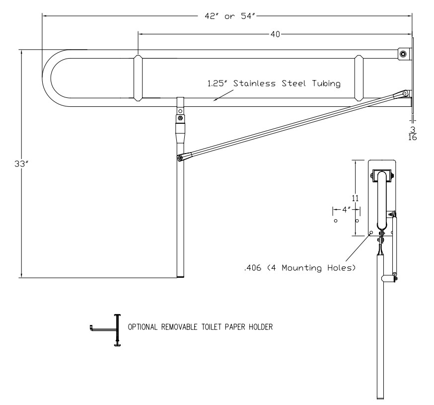 Elcoma 97-2254-SLEG 54" Friction Hinge Flip-Up Safety Rail with Leg with Stainless Steel Wall Bracket - Smooth Grip - Satin Finish