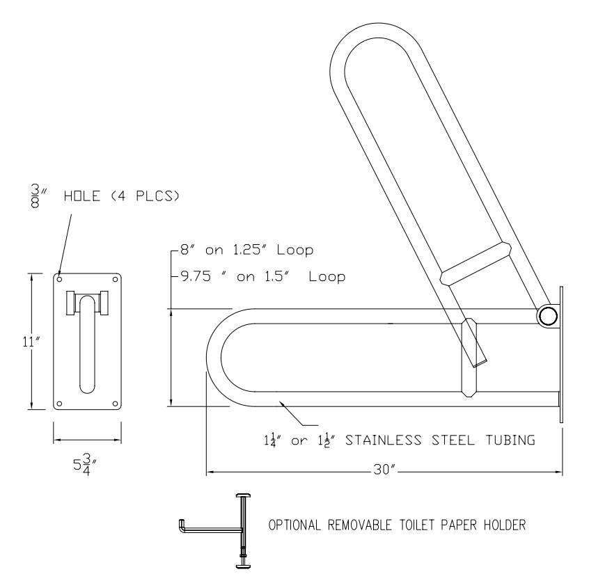 Elcoma 99-5230-KW05 30" Friction Hinge Flip-Up Safety Rail with Zinc Wall Bracket - Knurled Grip - Satin Finish