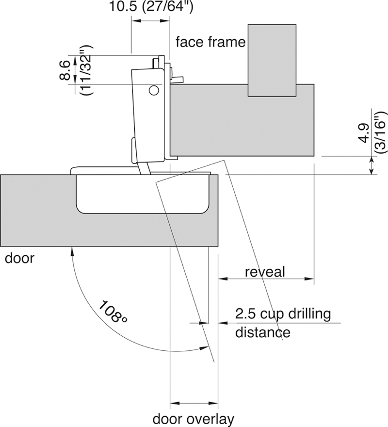 • The 108 degree hinge has three dimensional adjustment: (1) cam side adjustment (+/- 1.5mm) (2) cam depth adjustment (2.5mm out and .5mm in) and (3) slotted screw hole height adjustment (+/- 2mm)