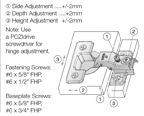 Use #6 x 5/8" flat head screws for base plates and cup fastening