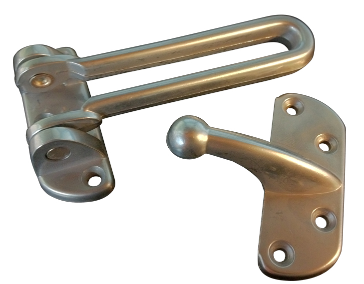 The solid bar, interlocking with the ball on the strike plate, permits the door to be slightly opened to allow viewing.