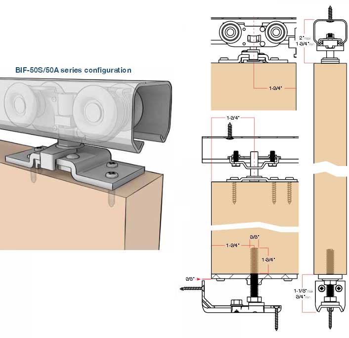 For 3/4" to 1-1/8" door thicknesses, order individual tracks and part bags PB-BIF-50-2ND for two door applications and PB-BIF-50-4ND for four door applications.