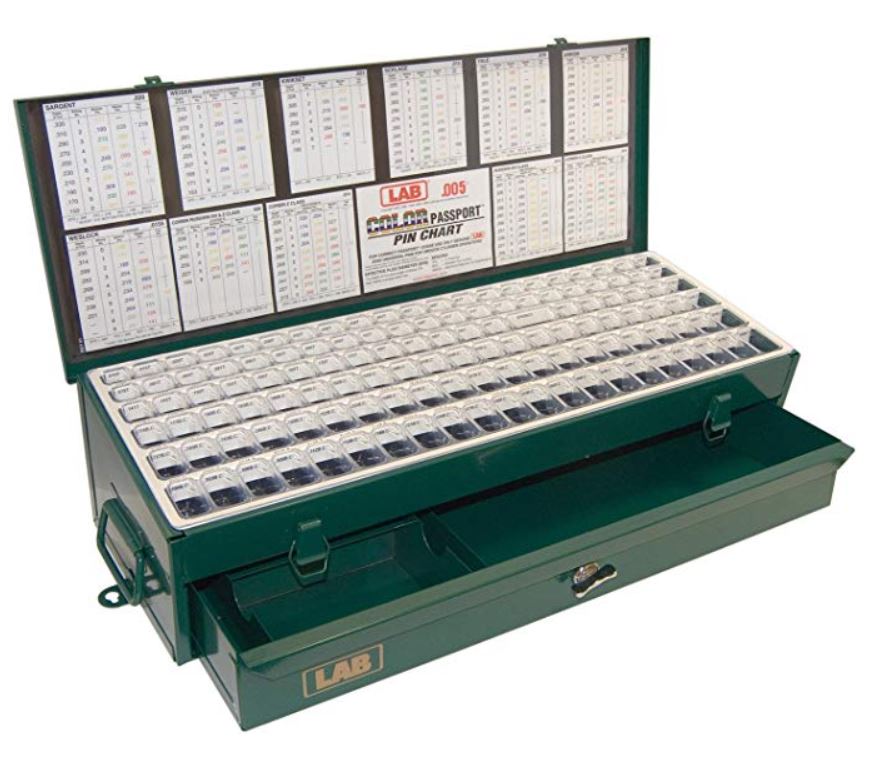 The Super Wedge with Drawer pinning kit is a universal .005 System kit containing color coded brass pins in 102 sizes, bottom pins 0.150 - 0.360 and top pins 0.010 - 0.300. There are quantity 50 of each pin and 100 springs. Mesures 21-5/8" x 8-1/2" x 4-1/2" (Front) x 5-3/4" (Back).