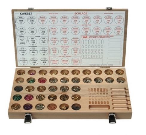 The LW21SK is a 2-In-1 Schlage & Kwikset Original pinning kit. Included are 100 each Schlage nickel silver bottom pins & brass master & top pins, Kwikset color coded brass bottom, top & Master pins. Also included are Schlage cylinder cap pins & springs. Measures 14-1/2" x 8" x 2" and contians a 6-cylinder pinning block.