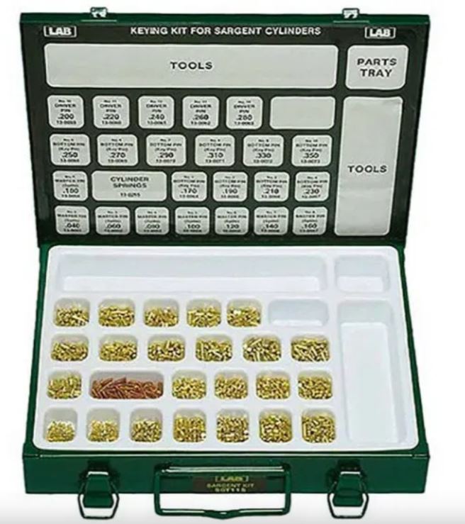 The SGT115 is a Sargent Original pinning kit. Included are 100 each brass bottom, master & top pins and cylinder springs. Measures 11-1/8" x 8-1/4" x 1-3/4".