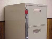 Red tape strip on inside of locking bar indicates unlocked position and protects painted finish on filing cabinet when locked