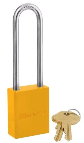 Master Lock 6835LTYLW — Master Lock Company Padlock Yellow Powder Coated Aluminum Safety Padlock 1 1/2" Wide 3" Tall Shackle 5-Pin Cylinder Keyed Different