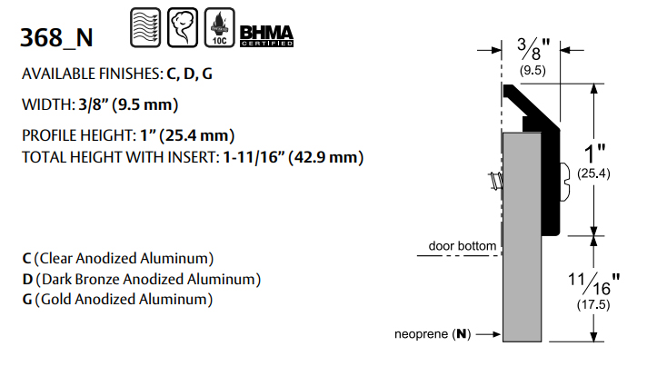 36" door bottom door shoes in mill finish aluminum with black PemkoPrene insert.