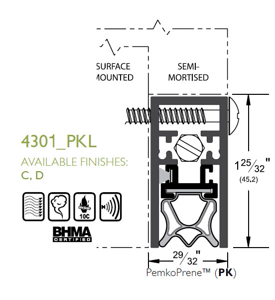 Pemko 4301CPKL 32" Automatic Door Bottom with Pemko Prene insert - Clear Anodized Aluminum - Surface/Semi-Mortise Mount