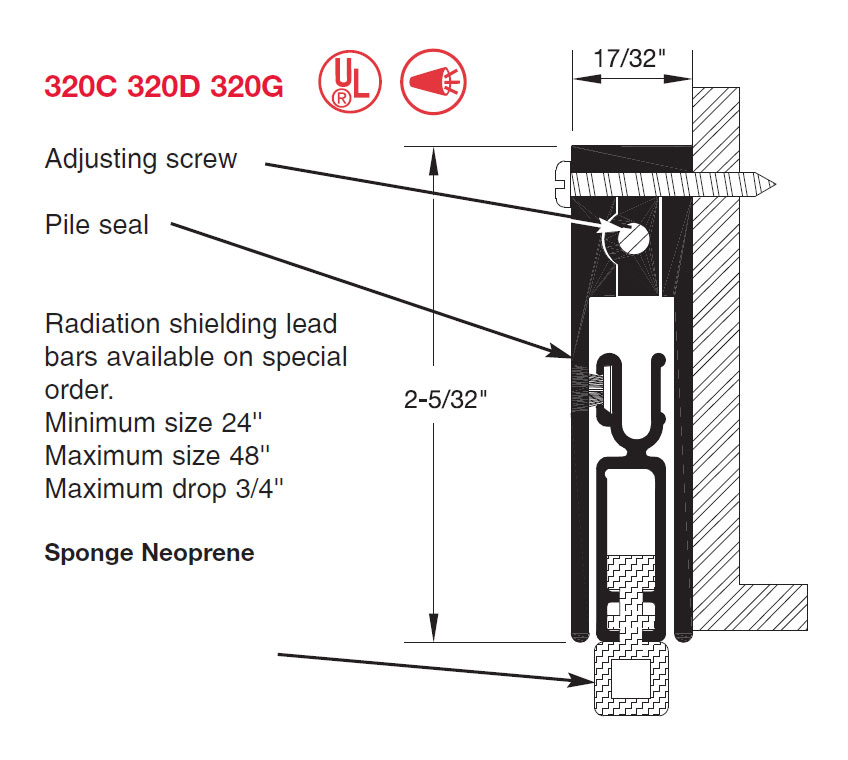 Automatic Door Bottom with Sponge Neoprene and Pile Seal insert, includes radiation shielding lead bar, Length: 48", Width: 17/32", Height: 2-5/32", Material: Clear Anodized Aluminum Surface Mount