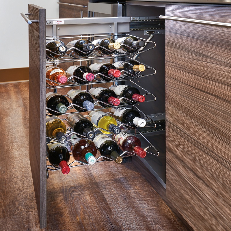 This wine pullout is the perfect addition for any wine enthusiast or kitchen gourmet. House twenty bottles of wine in our gorgeous European inspired organizer, perfect for Frameless, Face Frame and Inset cabinet applications.
