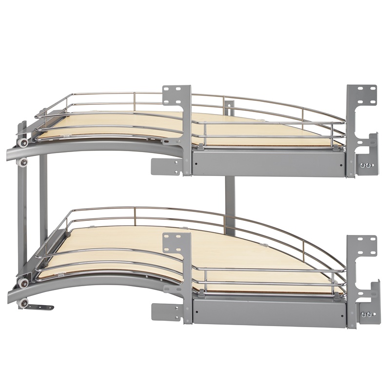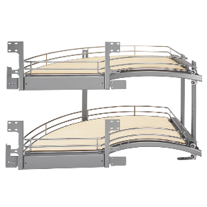 The individual door mountable shelves provide a custom 2-Drawer look for your blind corner, and allow for complete access to your cabinet, utilizing an amazing 775 square inches of surface area. All while gliding on the innovative roller coaster design; heavy-duty soft-closing slides (recommended not to exceed 60 lb per shelf).