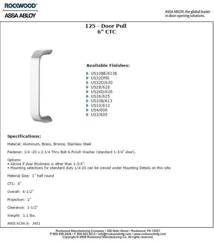 Rockwood 125-626 Satin Chrome Plated Brass Door Pull No. 125