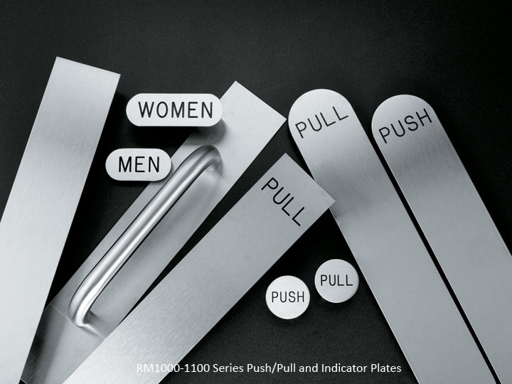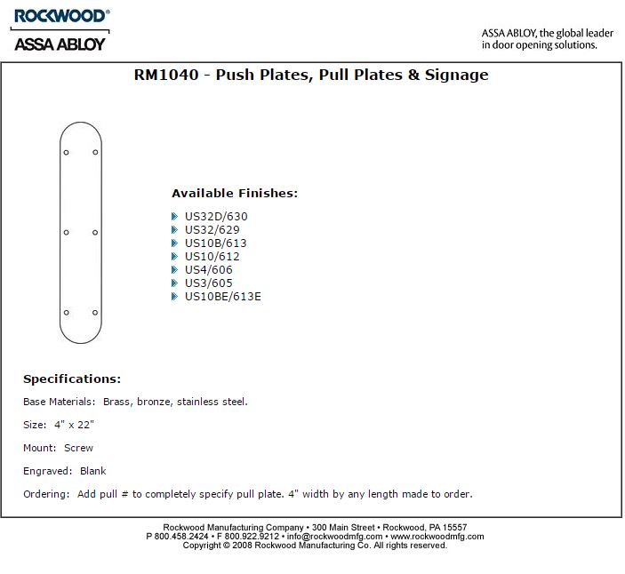Rockwood offers a selection of push and pull plates hand finished in our factory to match our pulls. All plates are .050" thick and available in screw or adhesive mounting. Custom engraved signs and plates are readily available.
