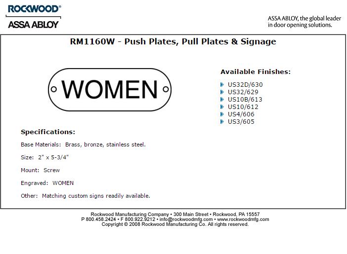 Rockwood RM1160W-630 WOMEN Indicator Plate - 2" x 5-3/4" - Screw Mount - Satin Stainless Steel