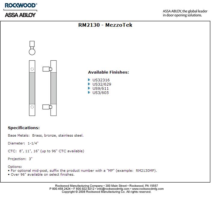 MezzoTek pulls appear to float on necked posts yet are made with Rockwood's unique sturdy construction. Available in most architectural finishes in 1-1/4" and 1-1/2" diameter pulls and push bars. Full height pulls are available as well. Our popular GripZone contrasting finish is available as shown in the drawings and detail photograph.