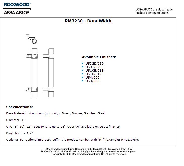 MezzoTek pulls appear to float on necked posts yet are made with Rockwood's unique sturdy construction. Available in most architectural finishes in 1-1/4" and 1-1/2" diameter pulls and push bars. Full height pulls are available as well. Our popular GripZone contrasting finish is available as shown in the drawings and detail photograph.