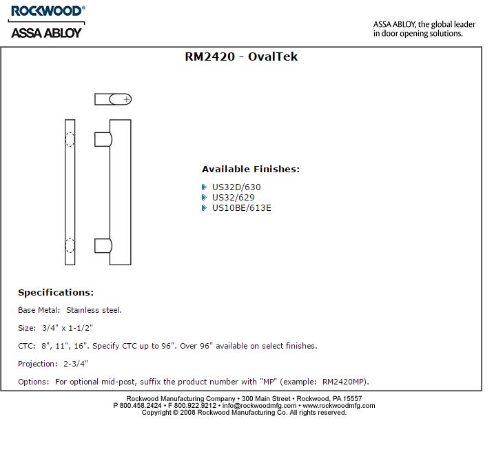 Rockwood RM2420-36-630 Straight OvalTek™ Flat Oval Grip Pull Bar with Oblong Posts - 36" CTC - Satin Stainless Steel