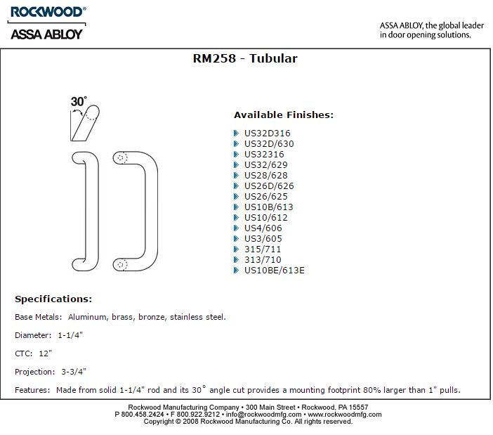 Our 1-1/4" and 1-1/2" diameter tubular pulls and pushes are made from rugged 16 gauge wall tubing with solid brass end inserts. These large diameter pulls provide a greater door contact area (1-1/4" pulls have 60% larger and 1-1/2" pulls have 125% larger mounting area than 1" pulls) which ensures that Rockwood's guaranteed fastening system will provide a tight permanent installation. Our RM257 pulls is made from solid 1-1/4" rod and its 30 degree angle cut provides a mounting area 80% larger than 1" pulls.