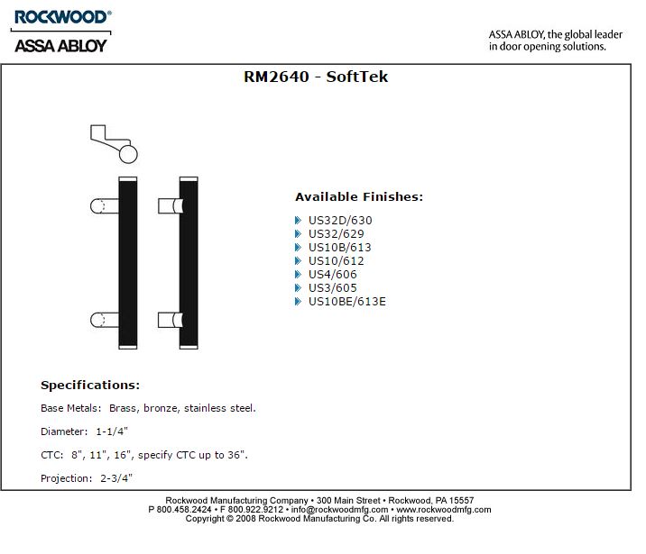 The SoftTek pulls feature a durable weather resistant black 1-1/4" diameter Santoprene⢠grip that provides a soft, warm feeling gripping surface. They are suitable for both interior and exterior applications. These grips are comfortable to touch even in cold temperature extremes. Available in straight and offset pulls and push bars in all architectural finishes.