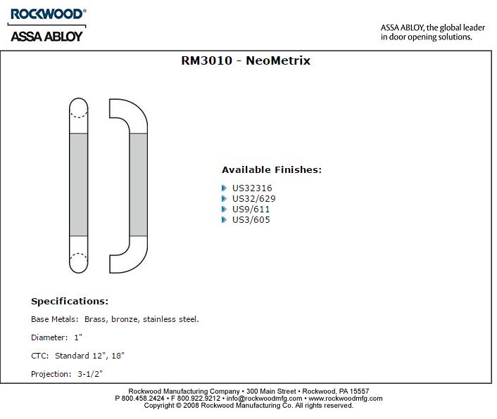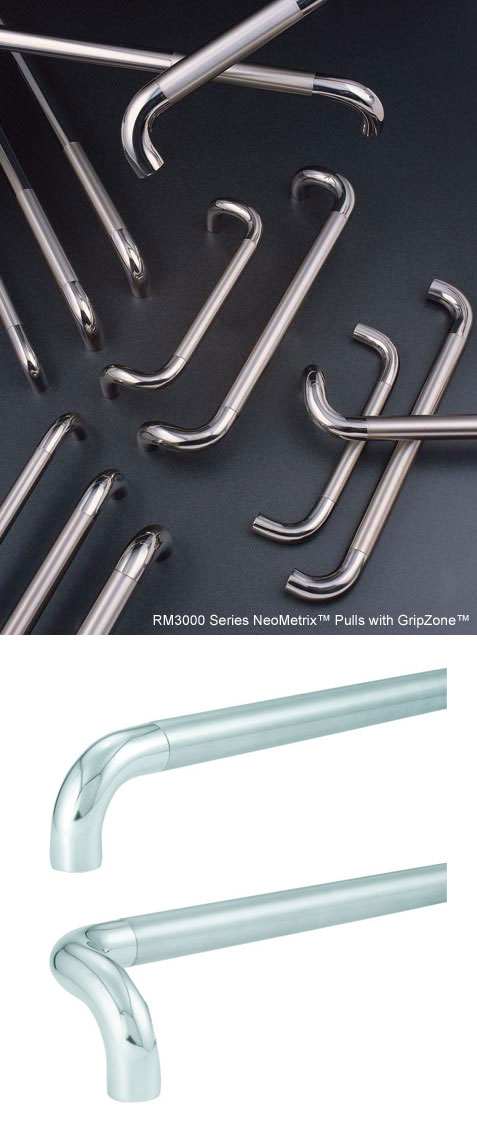 The NeoMetrix line features GripZone - a satin finished grip area contrasting to the bright mirror finish at the ends. Not only visually appealing, this winning design is practical as well. The satin finish hides small marks and scratches caused by rings, jewelry, and keys. On push bars, the GripZone identifies which side of the door swings open.