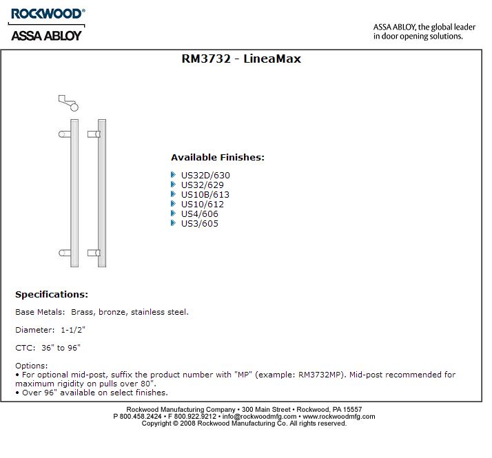 The crisp appearance of LineaMax makes a beautiful long door pull. Two post mounted styles - one with solid smooth ends and the other fully grooved are available in both straight and offset versions. Bent end version available as well. Base metals of brass, bronze, and stainless steel allow a wide variety of finishes. Available in 1-1/4" and 1-1/2" diameters and any length required.