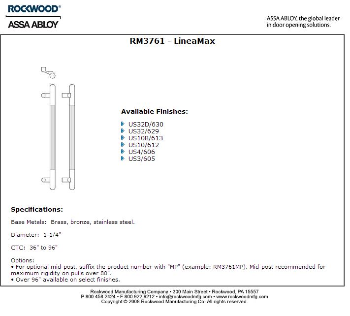 The crisp appearance of LineaMax makes a beautiful long door pull. Two post mounted styles - one with solid smooth ends and the other fully grooved are available in both straight and offset versions. Bent end version available as well. Base metals of brass, bronze, and stainless steel allow a wide variety of finishes. Available in 1-1/4" and 1-1/2" diameters and any length required.