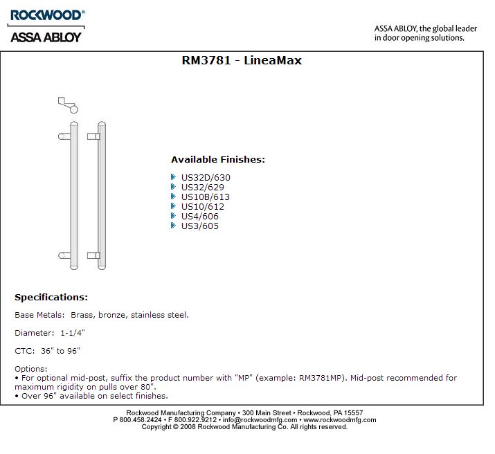 The crisp appearance of LineaMax makes a beautiful long door pull. Two post mounted styles - one with solid smooth ends and the other fully grooved are available in both straight and offset versions. Bent end version available as well. Base metals of brass, bronze, and stainless steel allow a wide variety of finishes. Available in 1-1/4" and 1-1/2" diameters and any length required.