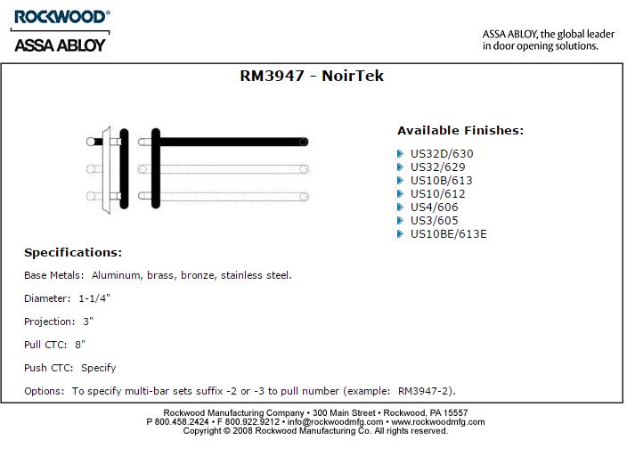 Set includes: one (1) RM3916 Push Bar and one (1) RM3944 Pull Bar