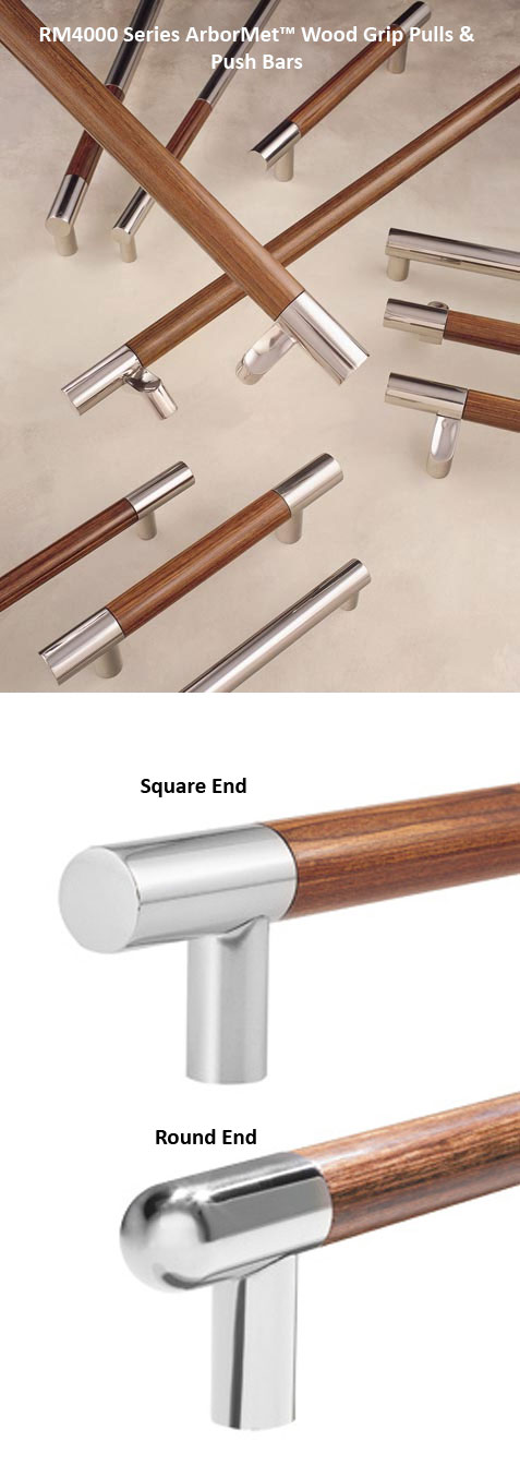 The ArborMet group combines the alluring warmth of wood with the unrivaled strength of solid brass and stainless steel. Offered in a variety of wood species including some exotics to compliment an elegant entrance. Each variety offering unique markings and tone. The gripping surface actually feels warmer to the touch than metal based pulls.