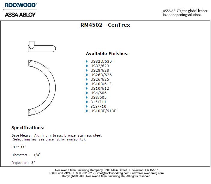 Rockwood RM4502-11-626 CenTrex™ Semi-Circular Large Radius Pull Bar - 11" CTC - Satin Chrome Plated Brass