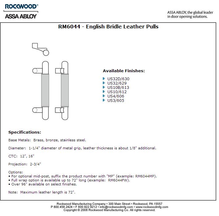 English bridle leather wrapped pulls are available in straight and offset versions for thru bolt and back to back mounting. We use 8 ounce hand colored vegetable tanned English Bridle leather which is tightly wrapped and neatly sewn along the back. Typically used for saddles and equestrian products, this smooth durable leather is suitable for both interior and exterior applications. Door pull base material is available in brass, bronze and aluminum as well as stainless steel.