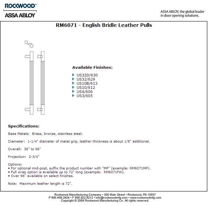 English bridle leather wrapped pulls are available in straight and offset versions for thru bolt and back to back mounting. We use 8 ounce hand colored vegetable tanned English Bridle leather which is tightly wrapped and neatly sewn along the back. Typically used for saddles and equestrian products, this smooth durable leather is suitable for both interior and exterior applications. Door pull base material is available in brass, bronze and aluminum as well as stainless steel.