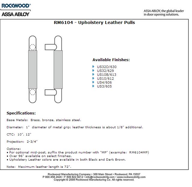 Upholstery leather wrapped pulls are available in straight and offset versions for thru bolt and back to back mounting. We use 3 to 4 ounce chrome tanned leather which is tightly wrapped and neatly sewn along the back. This glove soft leather is suitable for interior applications. Door pull material is available in brass, bronze and stainless steel.