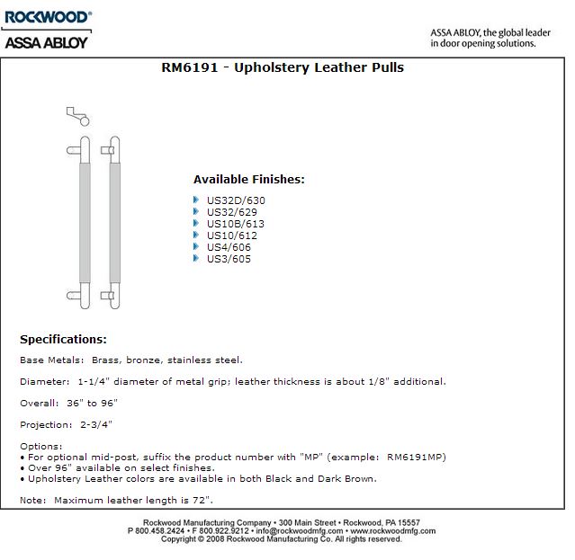 Upholstery leather wrapped pulls are available in straight and offset versions for thru bolt and back to back mounting. We use 3 to 4 ounce chrome tanned leather which is tightly wrapped and neatly sewn along the back. This glove soft leather is suitable for interior applications. Door pull material is available in brass, bronze and stainless steel.
