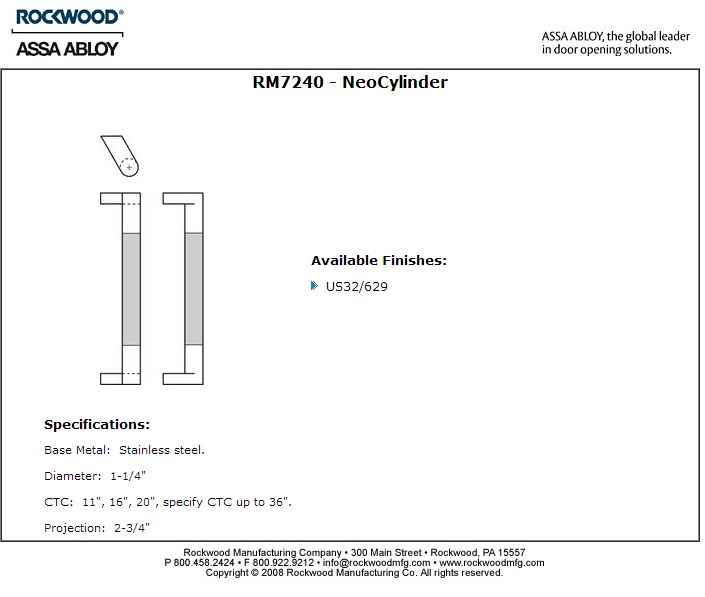Rockwood RM7240-28-629 Offset NeoCylinder™ Pull with GripZone™ - 28" CTC - Polished Stainless Steel