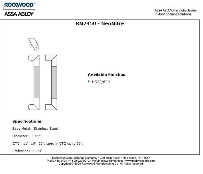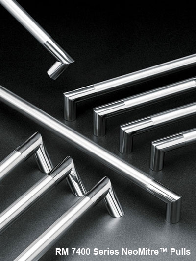 Rockwood mitre pulls are fabricated by a precise process that accomplishes the joint without any sign of welding residue. The GripZone feature of NeoMitre adds appeal to the design. Beyond providing an attractive contrast, the satin finish contact area conceals small scratches caused by routine use. Available in three diameters and custom lengths
