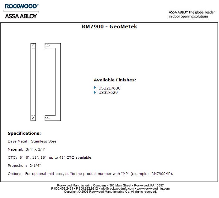 Rockwood RM7900-40-630 GeoMetek™ Narrow Profile 40" CTC Straight Square End Pull - Satin Stainless Steel