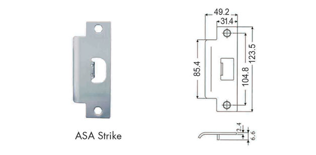 • Strike: ASA Standard, 1-1/4" x 4-7/8" x 1-5/16" standard, T-Strike optional