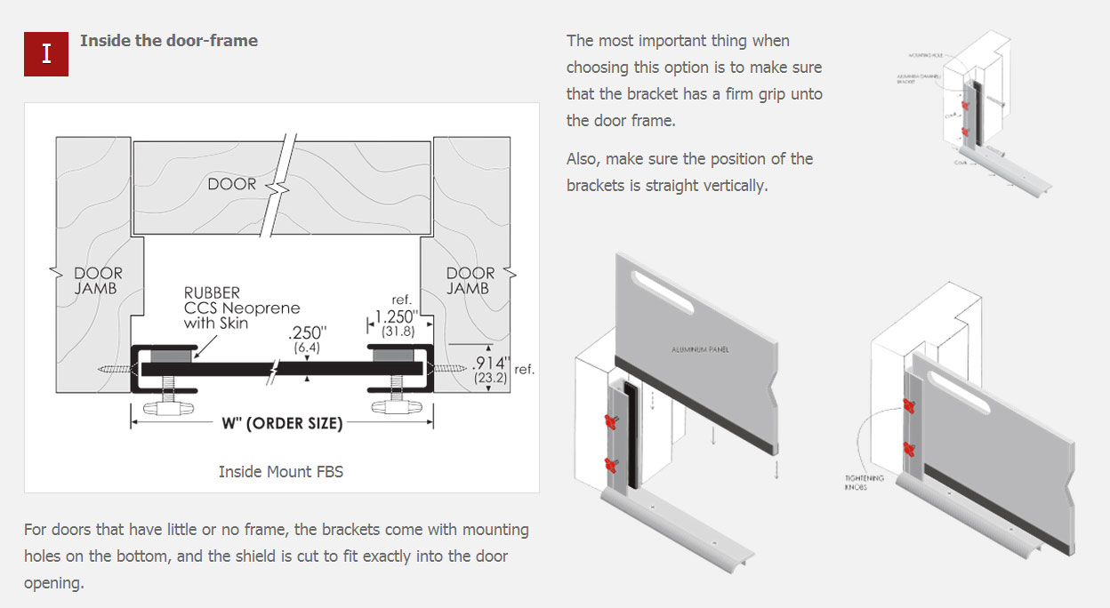 The lightweight aluminum shield requires no tools or muscle strength for insertion into premounted vertical channels attached to either the door frame or adjacent walls