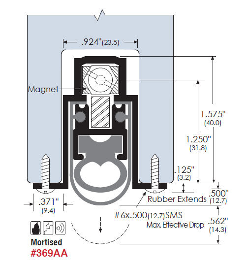 ZERO’s patented automatic door bottom technology ensures a tight seal against the floor or saddle. As the door is closed, an adjustable "plunger" is compressed against the door frame, activating a concealed flat spring mechanism. This mechanism drops the seal smoothly from the housing in a scissor-like motion as illustrated below. The door seal compresses tightly even on uneven surfaces and retracts automatically when the door is opened.