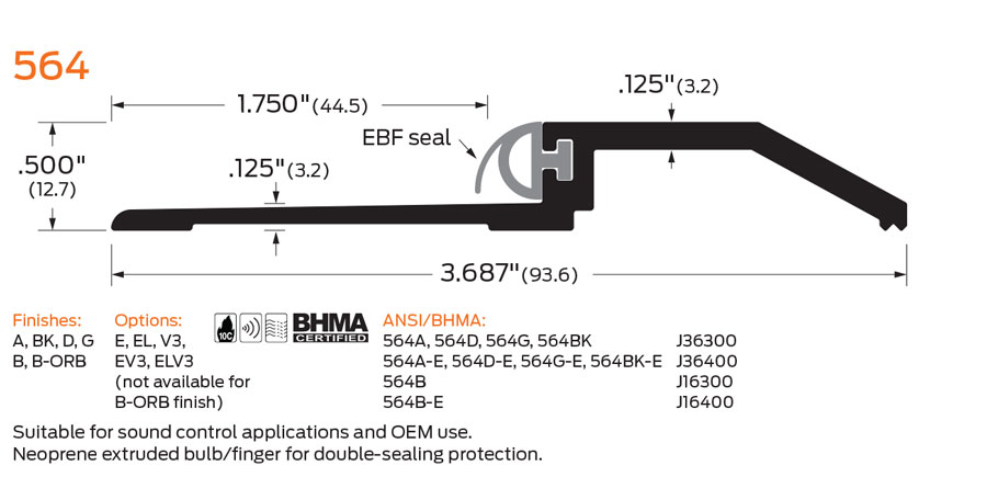 Zero 564A 36" Rabbeted threshold with Neoprene Insert, 3.687"W x 1/2"H, 36" Length, Mill Finish Aluminum