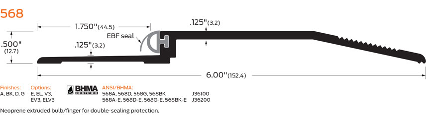 Zero 568A 36" Rabbeted threshold with Neoprene Insert, 6"W x 1/2"H, 36" Length, Mill Finish Aluminum