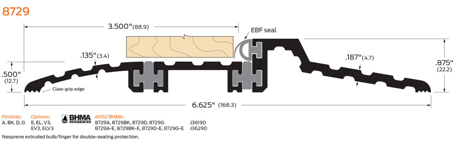 Zero 8729G 56" Thermal break threshold with 2 PVC Breaks and Neoprene Insert, 6.625"W x .875"H, 56" Length, Gold Anodized Aluminum