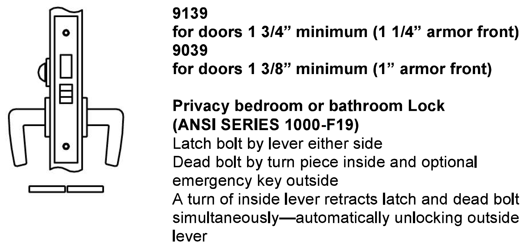 Latch bolt by lever and Deadbolt by thumb turn Inside/Latch bolt by lever and and Guest or Master Key Outside