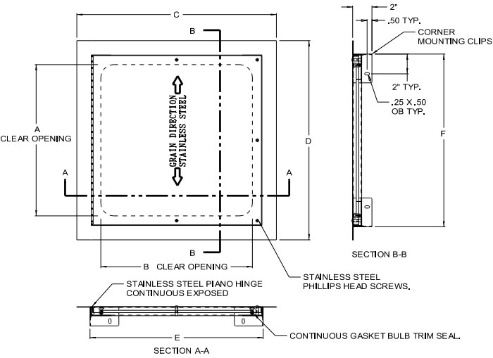 16 gauge; Mounting Frame: 16 gauge/ Flush to frame with reinforced edge