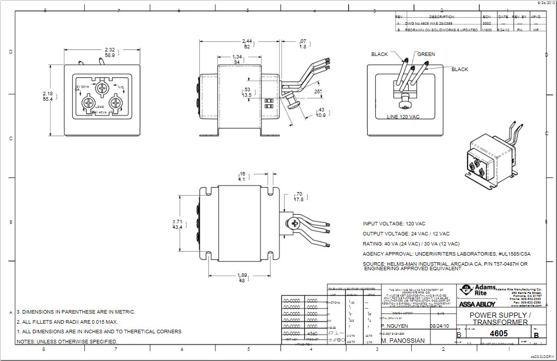 Adams Rite 4605 Transformer (12VAC, 30VA-24VAC, 40VA)