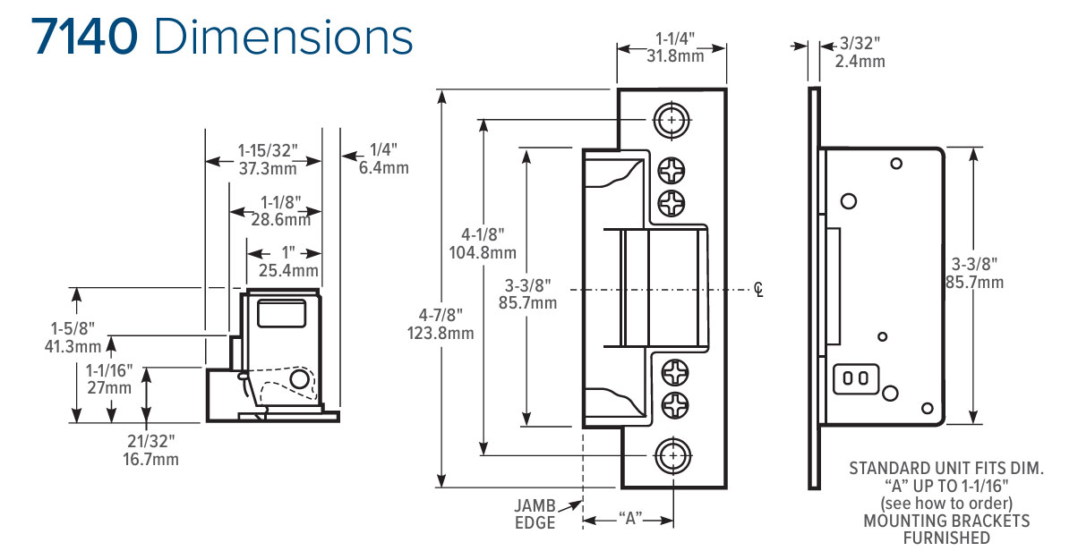 Strike Lip: Basic strike has lip of proper length for 1-3/4" [44.5 mm] thick door that closes flush with jamb edge. Where door thickness or jamb shape differs from this standard relationship, lip extension kits are available, specified by last dash number.
